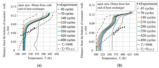 Temperature profiles at the open area next to the (a) cold and (b) hot ends of the heat exchanger assembly—comparison between the experimental and numerical model with different approaches of temperature initialisation.