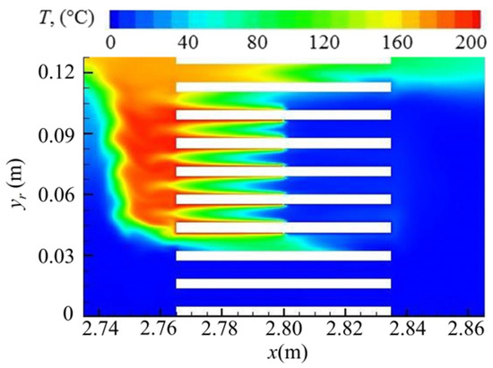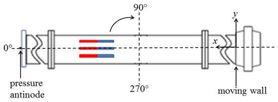 The presence of the temperature field introduces new elements to the flow physics including natural convection, stronger forced convection due to gas thermal expansion, or thermo-viscous interplay in the boundary layers. A few different sets of thermal boundary conditions were applied to heat exchangers, as summarised in Table 1. Here, the temperature profile was assumed to be “flat” as only one case had experimental data available. However, this particular case ( = 200 °C, = 30 °C) was solved in two ways: first, with the wall temperature from Figure 3, for code validation, and second, with the “flat” temperature profiles to compare between different numerical cases. The drive ratio (defined as the ratio of pressure at the antinode to the mean pressure) of the flow is maintained at 0.3%.