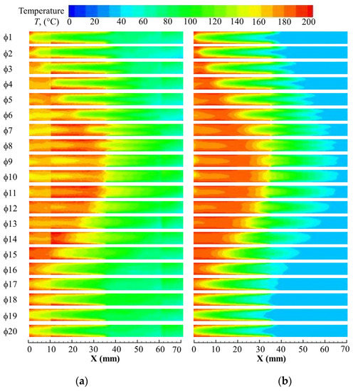 Figure 15a shows the experimental temperature contours for all twenty phases of the cycle inside the channel formed by the HHX and CHX walls, while Figure 15b shows the CFD solutions for the same “viewing area” as used in the experiment. Qualitatively, there seems to be a fairly good agreement between the two in terms of flow physics. The differences in magnitude, particularly at the right side of the viewing area, are mainly due to the difficulty of achieving numerically the experimentally recorded mean temperature of the flow. However the trends of the temperature distributions are the same for all phases in the cycle. Hot fluid starts flowing into the channel from the left during the first part of the cycle (1–10). As the flow reverses (11–20), the cold fluid starts flowing from the right. The temperature within the channel is bounded by the experimental temperature profile set at the cold plate (cf. Figure 3). Therefore achieving higher mean temperature within the cold channel, as observed in the experiment, cannot be obtained under the current numerical time integration and modelling. Of course the discrepancies between CFD and the experiments may come from a variety of sources including the already discussed experimental errors as well as incorrect assumptions behind the numerical model compared to reality, e.g., the already discussed adiabatic boundary conditions, heat accumulation (vs. leakage) problems, or unknown (and experimentally unverifiable) three-dimensional effects.