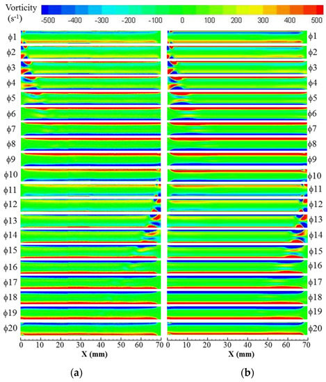 Vorticity contours within the channel with plates treated as adiabatic walls—comparison between the results from (a) the experiment of Shi et al. [11] and (b) CFD.