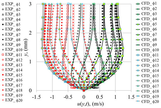Velocity profiles from computational fluid dynamics (CFD) model (black and grey lines) and the experiment (red and black symbol) for all 20 phases of a flow cycle. The heat exchanger walls are adiabatic.