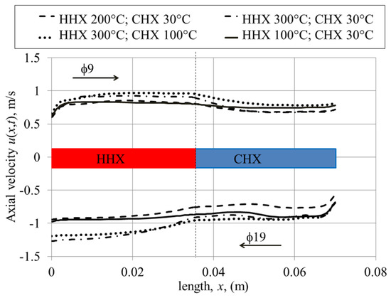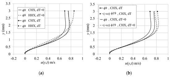 Secondly, the maximum magnitude of velocity fluctuation extends further to the centreline when temperature effects are included in the model as seen in Figure 20a. In the absence of temperature effects (adiabatic wall condition shown in Figure 20 as dT = 0), the velocity profile is similar at both CHX and HHX. When the temperature effect is considered, the velocity profile at the HHX seems shifted up towards the centreline ( = 3 mm) and the magnitude of the velocity is larger compared to an equidistant location at the CHX. On the other hand, focusing on one location, Figure 20b shows that the velocity profiles at the selected point of the CHX in analogous phases of the two flow directions (i.e., 9 vs. 19 here), are also affected by the presence of temperature effects. For ease of comparison, the axial velocity of 19 in Figure 20b is presented as a negative (−ve) value. The presence of temperature effects results in a lower centreline velocity at 9 but bigger magnitudes in the reversed flow direction at 19. The results indicate the changes in the viscous boundary layer due to the presence of temperature.