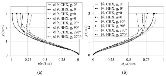 The effect of gravity and device orientation on the velocity profiles at a location 15 mm from the joint above the cold (CHX) and hot (CHX) plates for phases (a) 19 and (b) 9.