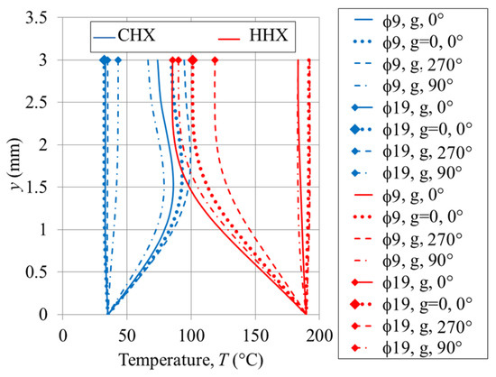 Temperature profiles for two selected phases, when there is no gravity (g = 0) and with gravity, g, at different tilt angles; 0°, 90°, 270°, at a location 15 mm from the joint above the cold (CHX) and hot (HHX) plates.