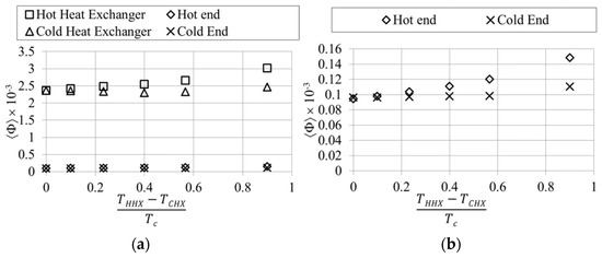 Figure 30 shows the effect of the heat exchanger wall temperature on the dimensionless viscous dissipation. The viscous dissipation at the open areas at both ends of the heat exchangers are one order of magnitude lower than the dissipation in the area containing the plates. This is consistent with the fact that the working medium interacts with more wall surfaces within the area of the heat exchanger where viscous resistance is significant, hence causing more energy dissipation. When the HHX becomes hotter, the dissipation becomes bigger. This is a consequence of gas viscosity that becomes bigger as the temperature increases. Figure 30b has an expanded y-axis to show dissipation levels at the ends of the heat exchanger assembly. It shows that the dissipation of energy at the open area next to the hot end is bigger than that next to the cold end and that it increases with an increase of temperature of the HHX. This is likely the combined effect of the larger gas viscosity at higher temperature and the more pronounced gravity-driven flow as seen by the development of the hot plume at that end.