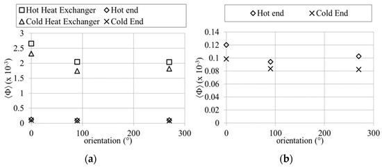 Figure 31 shows that viscous dissipation is lower in all areas when the device is set at a vertical orientation. Gravity determines the flow direction of the hot plume. For vertical arrangements (90° and 270°), the temperature-driven flow is in line with the direction of the flow. The temperature-driven flow can either assist or obstruct the flow depending on the device orientation and the direction of flow within a flow cycle. This may affect the magnitude of the velocity as the fluid flows back and forth within the heat exchanger, but the gradients of velocity near the wall are approximately the same, as seen in Figure 26. However, the low dissipation of the device arranged at vertical orientation indicates that the combined effect of temperature-driven flow and the mean flow may help reduce the viscous dissipation that may relate to the re-circulation of the fluid. The horizontal arrangement (0°) results in a temperature-driven flow perpendicular to the direction of the flow. Hence, re-circulation tends to be bigger in comparison to the vertical arrangement.