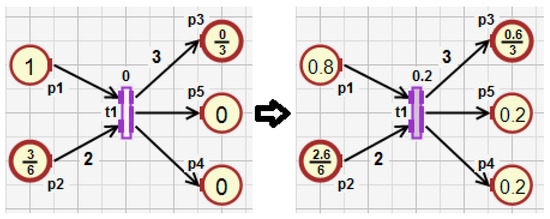 Figure 2 shows the exemplary change of the marking for places connected to the active transition t1. The increment of the degree to which the condition corresponding to the transition t1 is satisfied has the value of at the time when the synchronization signal arrives. Such a change of the marking gives a more precise visualization in comparison to discrete PNs and enables the monitoring of progress in the movement of tokens between the input and output places across the transition.