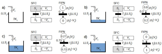 At the end of this section, a simple example is shown to clarify the main advantage of FIPN in comparison to classic Petri nets. In Figure 3a–d, the tank TK1 that can be filled using the valve V1 is presented, and two different graphs as control systems to fill TK1 are proposed. The first is created using SFC, and the second is based on FIPN. Different levels of liquid in TK1 and corresponding to the states of both systems are also shown. In general, the systems operate in a similar manner. First, the filling of TK1 is started by active step S1/ the place p1 which opens the valve V1 (variable V1 is set to true). Next, when the tank TK1 is completely filled, active step S2/place p2 closes the valve (variable V1 is set to false). However, both systems differ in one important aspect. While in the system based on SFC a binary sensor to monitor the level of liquid is used (LLS1), the system based on FIPN allows the application of an analogue sensor (the same name LLS1 is used to facilitate a comparison of both systems). First, the filling process of TK1 begins, as shown in Figure 3a. Then, different levels of liquid in TK1 during filling process are presented in Figure 3b. Finally, TK1 is completely filled (see Figure 3d). The control system based on SFC enables only the display of two states: if the tank TK1 is being filled (Figure 3a–c) or is completely filled (Figure 3d), whereas the system based on FIPN shows the actual level of liquid all the time. In addition, FIPN allows actions to be performed based on the actual level of liquid (the current marking of places), e.g., while a mixer is being filled with two liquids stored in tanks, and one of the tanks is being emptied too fast/slow compared to the other one, the mixing time can be increased. Hence, FIPN offers a more precise visualization and control of DES than classic Petri nets.