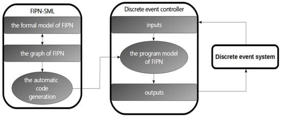 In this section, the program model based on FIPN (called FIPNP) is described. Before it is discussed, the conception of using this model through FIPN-SML to control DES is shown (Figure 4). The graph of FIPN can be created in the simulator. Based on this graph, the program in ST language can be generated and applied to PLC. The important part of the conception is the method of the automatic code generation presented in the next section.