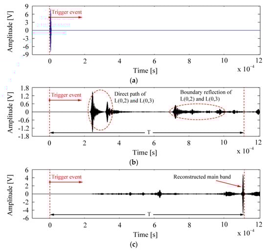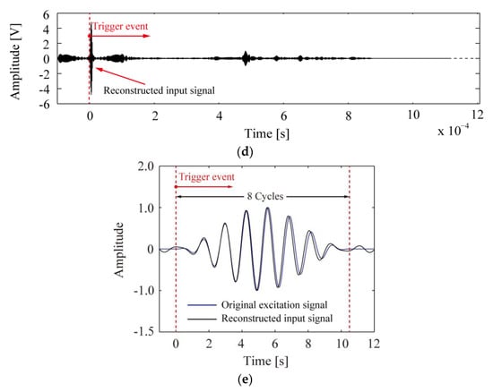 When a 8-cycle Hanning-windowed tone burst with the central frequency 760 kHz and the amplitude of 8 V shown in Figure 3a is applied to the actuator as an input signal, the response signal at the receiver mainly contains multiple modes of and , dispersion of which is relatively severe at the frequency. Furthermore, the both modes are of different transmission routes, namely, the direct path and the boundary reflected paths, as shown in Figure 3b. After the signal in Figure 3b is truncated at time , the extracted part is time reversed, normalized to the same amplitude as the original input signal, and then reemitted by the same actuator. Figure 3c shows the received signal after TRM and the reconstructed main band with no dispersion and more than 3 times improved amplitude. Reversing the signal in Figure 3c with respect to an axis of in accordance with Equation (7), the reconstructed input signal focuses on the trigger position exactly, which is obvious to see in Figure 3d, and bears a striking similarity to the original excitation signal particularly exhibited in Figure 3e.
