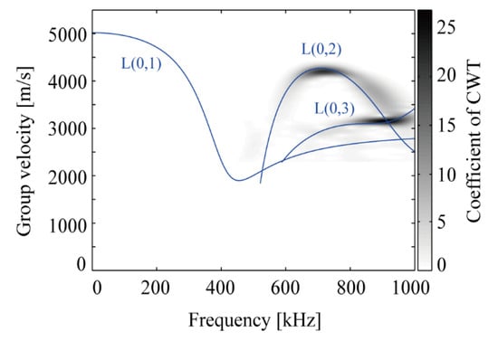 As shown in Figure 4, only mode is generated when the central frequencies of excitation are below 740 kHz. With the central frequencies progressively promoted above 750 kHz, mode is gradually increasing and coexists with mode . The 790 kHz is determined as the central frequency of excitation for damage detection, which will be elaborated in Section 5. Both the received modes and are approximately the same amplitude under the excitation of such frequency as illustrated in Figure 5.