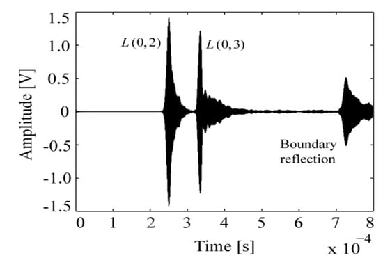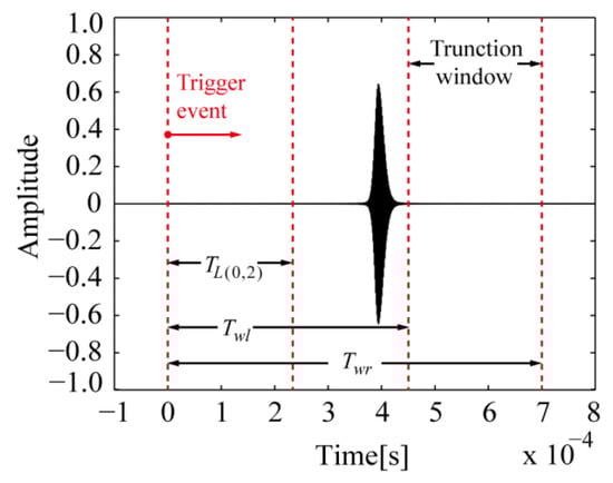then can be predetermined consequently. Where, is the number of sampling points of frequency, and is the length of the rod. In terms of the right side of the truncation window , it should be set as the time when the first boundary reflection of the fastest mode arrives. The arriving time of direct mode can be clearly identified, so the time of its first boundary reflection is easily deduced as . The designed truncation window is shown in Figure 6.