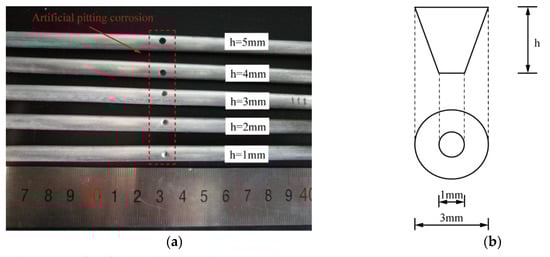 The samples are divided into three groups to reduce the impact of machining error on the test results. Each group contains 5 galvanized steel wires with 7 mm diameter, approximate 1 m length and an artificial pitting corrosion in their respective middle position. The pitting gradually increases from 1 to 5 mm at 1 mm intervals, keeping 3 mm and 1 mm diameter on the surface and bottom respectively unchanged to highlight the influence of depth variation. The manufactured corrosive samples of one group and the sketch of configuration are shown in Figure 7.