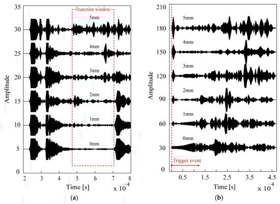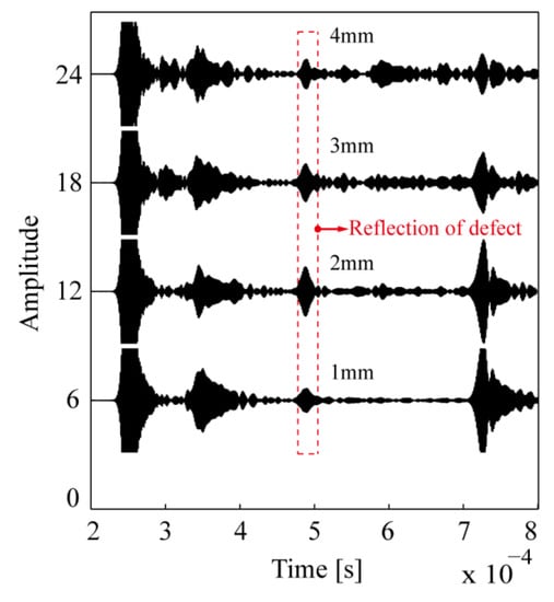 A 12-cycle Hanning-windowed tone burst is imposed on the actuator with a peak voltage of 8 V. The normalized received signals of the second group are exhibited in Figure 8a. It is illustrated that a quantitative evaluation for damages depending on is impossible, since the captured signals are extremely difficult to interpret in virtue of multimode, multipath and dispersion of guided waves propagation.