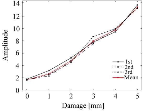 The defect scattered signals included in the truncation window are reversed, normalized to 8 V as the original excitation and then relaunched. In Figure 8b, with reference to the wires with 1 mm to 5 mm corrosive depths, focusing packets of emerge at the trigger point and their amplitudes increase evidently along with the aggravation of corrosion. However, in terms of a compared intact wire, there is no distinct focusing packet at the trigger point, which indicates that the truncated signals are not the defect scattered ones, but the system noise which can not be focused. It can be seen from Figure 9 that the reconstructed signal amplitudes of the three test samples exhibit almost the same linearly increasing trend in line with the growth of corrosive depth. The amplitudes of the focused wave packets improved by TRM is about 10 times that of the defect echoes directly used for damage quantification in the conventional testing method described in Section 5. In conclusion, TRM is a technique of relatively higher resolution corresponding to the variation of corrosive defects.