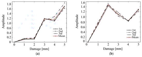 The dispersive behaviors of different modes are represented by dispersion curves like the ones shown in Figure 4. Mode , the only one which can be generated and received by the testing system in the frequency range between 0–200 kHz, is preferred as a candidate for damage detection because it is unnoticeably dispersed and apparently identified without disturbance from other modes. The point of minimum dispersion in mode at 700 kHz is at the point of maximum group velocity, which leads to the wave packet of mode easily separated from others to make accurate interpretation. For the foregoing reasons, modes and are generated at the central frequencies of 150 kHz and 700 kHz respectively under an excitation of 8 V, and then the normalized amplitudes of their defect echoes are applied to evaluate the damages as the conventional testing method in Ref. [5,6,27]. The results towards different depths are shown in Figure 10.