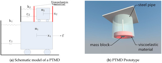Based on the fact that a large amount of energy can be dissipated during impact, a pounding tuned mass damper (PTMD) is developed by setting up a motion limitation around the mass of a tuned mass damper (TMD) device [34]. The basic schematic model of a PTMD device is shown in Figure 1. As shown in the figure, a viscoelastic (VE) layer is attached to the limitation collar. Unlike some limitation collars found in traditional TMD devices, the limitation can not only function to prevent extreme vibration of the mass, but it can also further dissipate vibration energy through the deformation of VE layer during impact. When a certain gap is set between the mass and the limitation, impact will happen between the mass and the VE layer as soon as their relative displacement reaches the gap value. As a result, during operation, this device can absorb vibration energy of the host structure and transfer it to the kinetic energy and potential energy of the attached mass, as well as some heat energy from the impact. The amount of kinetic energy is largely dependent on the weight and the moving speed of the mass; the potential energy is affected by the stiffness of the connection; the amount of impact energy will be dependent on the relative velocity and deformation of the VE layer. Therefore, by changing the mass, stiffness, and gap of the TMD will definitely vary the control efficiency under different cases.