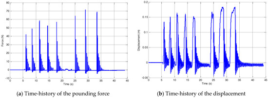 A small-scale experiment is carried out for validation of the improved numerical pounding force model [34]. Figure 2 shows the setup of the experiment. A mass is driven by an attached motor and impact happens between the mass and the surface of a semi-ring to which seven layers of 3M VHB4936 tape adhere. A force sensor is installed beneath the semi-ring to measure the pounding force, and a Keyence Lbl1 laser sensor (Keyence, Osaka, Japan) is installed to capture the displacement of the mass. The data is collected by dSPACE 1104 (dSPACE, Shanghai, China) and the sampling frequency is set as 1000 Hz. The measured pounding force and displacement are shown in Figure 3.
