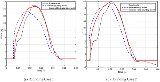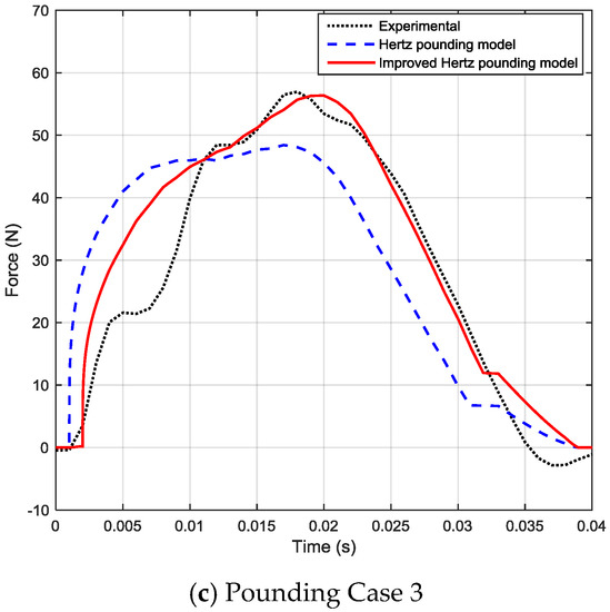 One of the most popular contact force models used in the impact events is proposed by Lankarani and Nikravesh and further improved for higher-impact velocities [35,36], this model gives an expression for the hysteresis damping factor relating the kinetic energy loss due to internal damping, and it has been utilized in many domains [37,38,39]. More recently, Gonthier et al. proposed a three-dimensional contact force model that can be used to simulate fully elastic to completely plastic impacts [40]. Another Hertz contact theory-based contact force model recently published was developed by Flores et al. [41]. This model uses a hysteresis damping parameter that accommodates the loss of energy during the contact process. Most of these pounding models have their respective suitable domains of applications, and most of them can only be accurate when the impact objects are considered to be rigid, the contact area is small, and the impact velocity is not too large.