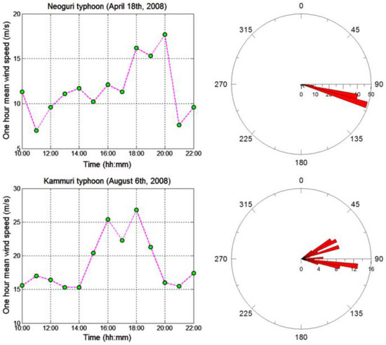 In order to study the feasibility of the PTMD on vibration control of civil structures under wind load and earthquake excitations, a benchmark model of the Canton Tower is selected as the host structure. The Canton Tower is located in Guangzhou, China. It has a total height of 600 m, includes a 454 m high main tower and a 146 m high antenna mast. The composite main tower has a reinforced concrete tube covered by a steel lattice. A sophisticated SHM system consisting of 16 types of more than 700 sensors has been installed in the tower. The SHM system has continuously acquired response data and loading data, such as temperature and wind speed, since 2010. As of today, the SHM system has successfully recorded the dynamic responses of the structure under several severe events, such as earthquakes and typhoons. Sets of ambient data have been adopted to verify the correctness of the full-order and reduced-order models in the previous study [43]. Particular wind speed data and wind rose diagrams drawn based on the monitor on top of the main tower during typhoons are shown in Figure 5. In the following simulation of this paper, two sets of the wind load data will be extracted from selected typhoons to verify the control effectiveness of the proposed PTMD device.