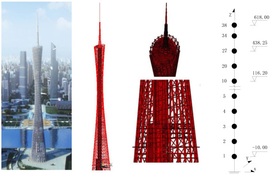 The benchmark problem for this tower originates from the structural health monitoring and damage detection problem of super-high-rise structures. Both a full-order FE model and a corresponding reduced-order model are established by the first author of this paper. Since the purpose of this paper will focus mainly on the global dynamic responses of the structure, the reduced order FE model is adopted in this study. The reduced-order model has been validated in the previous study [43] by field test data to have great precision and can describe the dynamic characteristic of the structure well. In the reduced-order model, the whole structure is modeled as 37 beam elements (27 for the main tower and 10 for the mast) and 38 nodes. Considering five DOFs for each node, which are the two horizontal translational and three rotational DOFs, a total number of 185 DOFs are included. The damping ratio of the structure was assumed to be 0.004 [44,45]. The layout of the model [46] is shown in Figure 6. Directions x and y represent the direction along the long axis and the short axis, respectively.