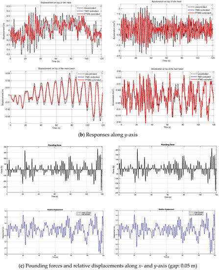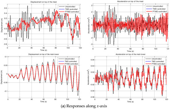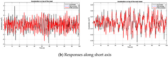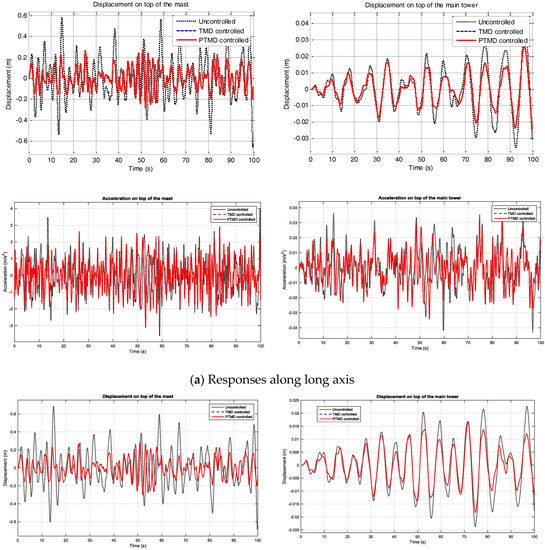 Under typhoon excitation, it is shown that the proposed PTMD shares similar control effectiveness; only slight improvement is noticed on the peak and the RMS values. It can be observed from the tables that both control approaches can reduce the peak and RMS responses. On the mast top, the peak displacement responses are reduced by 19.14% and 34.75% subjected to Typhoon Haima and Typhoon Nanmado excitations, respectively, and the RMS displacement responses are reduced by 21.50% and 33.23%. Meanwhile, the peak displacement response along the y-direction on top of the mast are reduced by 24.24% and 32.86% under these typhoon excitations. When it comes to the acceleration responses, 18.46% and 28.15% control effectiveness values are obtained for peak responses on top of the mast, and 30.84% and 32.53% for the reduction of the RMS responses. As listed in the table, the PTMD is able to reduce the peak displacement responses on top of the main tower by 24.23% and 20.72%, but it is also important to notice that the peak acceleration responses along the short axis on the tower top are slightly increased when the TMD or PTMD is installed.