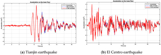 Unlike wind load excitation cases, earthquakes can generate more severe impacts between the mass and the host structure. Thus, a certain amount of energy can be consumed through the impact behavior. As mentioned before, the original gap value between the mass and the limitation should be selected carefully to guarantee beyond a certain impact level. Here the maximum gap value is decided based on the maximum relative displacement of the mass and the structure derived from TMD-controlled simulation results. Time history of uncontrolled, TMD-controlled, and PTMD-controlled displacement responses on the tower top are compared in Figure 11 when a 300 t mass is connected and the gap is set as 0.25 m. The corresponding pounding force is also shown in the figures. It is clearly observed from these results that the PTMD can produce much better performance on the reduction of earthquake-induced displacement. When the Tianjin earthquake strikes, the TMD failed to reduce the peak responses. On the contrary, the peak and RMS displacement responses are decreased by 60.10% and 64.82%, respectively, when the PTMD is installed. Data from Figure 11 and Figure 12 suggests that higher acceleration is needed to enable significant displacement reduction. This was observed especially when the Tianjin earthquake record was used. On the other hand, the acceleration on the lower floor is not severe, as shown in Figure 13. For now this is a major drawback for PTMD control, and this problem may be improved by the use of multiple, smaller PTMDs to make the displacement over the whole structure smaller.
