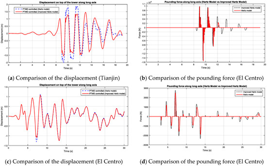 The comparison of time history displacement responses when using the improved pounding model and the Hertz-based pounding model is shown in Figure 14. As mentioned above, the traditional Hertz-based pounding model tends to underestimate the peak pounding forces especially when the relative velocities between the two impact bodies are large. The comparison results show that when the structure is subjected to the Tianjin earthquake, the improved Hertz model gives better control performances (approximate 32%) by fully considering the nonlinear damping coefficient during impact, and the dissipated energy during the impact behavior can be described more precisely. When the El Centro earthquake strikes, although the peak pounding force is larger, only slight improvement can be obtained when using the improved Hertz model. As similar comparison results between the control effectiveness of the TMD and PTMD controls is shown in Figure 12, the El Centro excitation did not generate a particularly severe impact compared to the Tianjin record. The dissipated energy through the impact behavior is relatively small and, in this case, the PTMD acts more like a TMD.