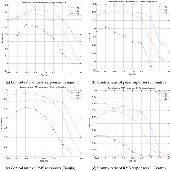 By fixing the gap value to 0.05 m, the influence of the mass ratio can be examined (Table 7). As seen in the table, both the TMD and PTMD systems tend to perform better with a larger mass ratio. However, the performance of the TMD varies significantly with the changing mass value and the excitations. Results show that the TMD can perform well under the El Centro excitations—both the peak and the RMS responses can have a reduction over 40%. In the Tianjin earthquake excitation cases, even though the mass of the TMD increases from 200 t to 500 t, the control effectiveness of the peak responses can only increase from −0.28% to 12.65%. On the contrary, promising results in which less variation are observed in the PTMD-controlled cases with the changing value of the mass ratio. The control results on the peak and the RMS varies little and remains above 50% in every cases. These results also indicate that the PTMD is able to achieve better control results with a lower mass ratio, which will result in easier installation and lower cost of the whole controlled system. In addition, the trend of the PTMD control results presented with respect to the variation of the intensity of the earthquake input clearly shows better improvement on the control efficiency under extreme excitations.