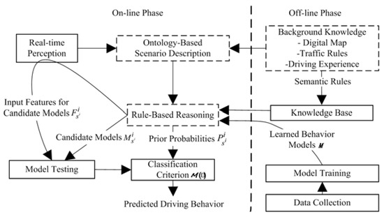 Figure 1 presents the architecture of the proposed driving behavior prediction approach, which can be divided into two phases: off-line phase and on-line phase. During the off-line phase, the road elements information was extracted from digital maps and described by the proposed ontology model. In order to learn the continuous features of driving behaviors, field data from typical urban traffic scenarios are collected first. Each type of driving behavior was learned by one HMM, i.e., a set of behavior models can be trained. Semantic rules are edited based on a priori knowledge (traffic rules, driving experiences) to define the candidate behavior models, input features, and prior probabilities for candidate models using scenario-dependent characteristics. All these rules were stored in the knowledge base. During the on-line prediction phase, all the learned models and semantic rules in the knowledge base were loaded into the working memory during the initialization process. At each time step, the scenario is represented based on a pre-defined ontology model and sensing data. are specified by the rule-based reasoning module. Then, each candidate learned model is tested to obtain the likelihood of each corresponding driving behavior . Finally, the behavior tag is decided by the behavior tagging model , which considers both model testing results (a posteriori probabilities) and a priori probabilities.