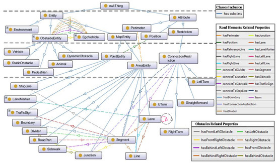 In order to represent the complex traffic scenario characteristics and intricate relationships between entities, this study proposed a novel ontology model to explicitly describe the traffic scenarios. The ontology model was edited by Protégé [29] software and parts of the ontology terminology are graphically represented in Figure 2. The classes (including Entity branch, Attributes branch) are enclosed by rectangles. Their semantic relationships are connected by the hierarchical object properties (dotted lines of different colors). The taxonomy relationships between concepts are plotted by light blue solid lines. The proposed ontology aims to cover all the possible scenarios in the urban environment. The Entity consists of four sub-entities: