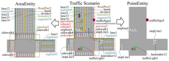 - MapEntity. The map entity is the most important part to describe the geometric topology of the roadway and road entities. The MapEntity class has two sub-classes: AreaEntity and PointEntity. The former entity represents one area of the road that cannot be simplified by a location point, such as RoadPart, Sidewalk, Junction, Segment, and Lane. PointEntity indicates the remaining road elements that can be considered a location point, e.g., TrafficSign, LaneMarker, StopLine. The detailed definition of these road entities and the decomposition are shown in Figure 3 (in the figure just one part of the entities are shown with the corresponding identifying number).