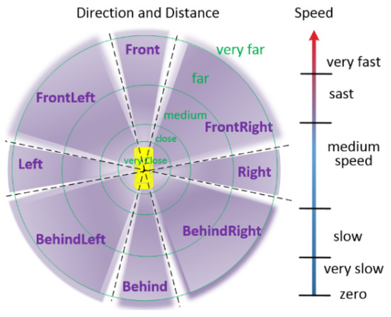 The object properties related to the obstacles are also shown in Figure 2. This study discretizes the direction from the view of the target vehicle (as Figure 4 shows). In this way, their relative position can be described qualitatively by hasFrontLeftObstacle, hasFrontObstacle, and so on [31].