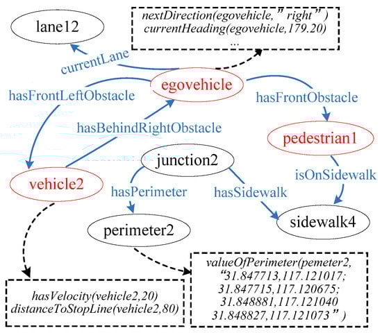 Based on the above definitions, for a given traffic scenario, each entity can be contextualized as one individual. The map-related instances were extracted from the high-resolution digital map [32] and assigned an identification number (as Figure 3 shows). Instances of traffic participants were built based on perception data. Figure 5 shows some example instances for the traffic scenario in Figure 3. The data attributes for each individual were assigned, e.g., the velocity of vehicle2 is 20 km/h, and the location of junction2 is expressed as a rectangle with four GPS coordinates. Relationships between different road entities were determined by their spatial relationships, e.g., sidewalk4 and junction2 have the relationship hasSidewalk. Interactions between vehicles can be defined according to pre-defined qualitative relationships, e.g., egovehicle hasBehandRightObstacle with vehicle2. Also, relationships between traffic participants and road entities can also be described, e.g., the currentlane of egovehicle is lane12.