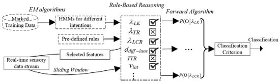 This section introduces the approach to predict the behaviors for the target vehicle (as Figure 6 shows). Firstly, a set of HMMs () corresponding to different behaviors were learned off-line based on the method in the last section. All these models were loaded into the memory of the on-line procedure during the initialization process. When given sequential observations for the vehicle are measured, the rule-based reasoning module will generate the candidate models , corresponding input features , and a priori probabilities according to the scenario characteristics. Each of the selected models will be tested to estimate how well () the model fits the given observations, using the Forward algorithm [36].