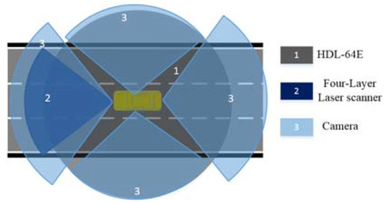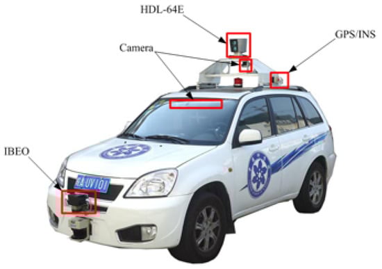 Figure 7 shows the experimental vehicle, “Intelligent Pioneer II”, which was developed by our team and won the first prize in the “2010 Intelligent Vehicle Future Challenge of China” sponsored by the Natural Science Foundation of China [37]. Various sensors are equipped on the vehicle to enable its autonomous driving functions. In this study, just parts of the sensors were applied, i.e., the IBEO four-layer laser scanners, one Velodyne HDL-64E LIDAR, one high-resolution camera, and one differential GPS/INS (SPAN-CPT) system. The sensor configuration of the vehicle is shown in Figure 8. The differential GPS module provides the ego vehicle’s location, speed, and heading. The moving obstacles were detected and tracked by the four-layer laser scanners (at the front of the vehicle), based on our previous work [25]. The location, velocity, size, and category of the moving vehicles (e.g., pedestrian, vehicles, etc.) can be measured based on their spatial–temporal relations with the experimental vehicle. All the surrounding situations were recorded by the camera. The perception range of the selected sensors is shown in Figure 8. We conducted the experiments in Hefei City (roadways are shown in Figure 9), which is a large city in China.