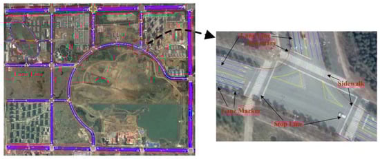 Before field data collection, the high-resolution maps were constructed. The map data were collected based on our experimental vehicle, and then post-processed and checked manually. Finally, the map, with more than 1600 road entities (e.g., stop signs, lane markers, lane lines, etc.) covered about 10 km of roadways (as Figure 9 shows). In the left part of Table 3, the elements of collected roadways are summarized.