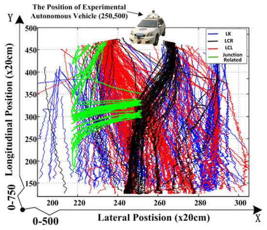 After the construction of the high-resolution map and the knowledge base, field data were collected on the test urban roadways over 15 days. The moving obstacles on the road were tracked at a frequency of 12.5 Hz. The data were recorded into the log files. In the end there were about 1000 events (one event is referred to as one-time tracking of a target vehicle), and 345 target vehicles were acquired. These events are summarized in the right-hand part of Table 3. The collected trajectories (in the experimental autonomous vehicle’s coordinate system) for target vehicles are presented in Figure 10. The experimental autonomous vehicle has a 750 × 500 rectangular Cartesian coordinate system, in which the heading of the experimental vehicle is the positive direction of the vertical axis and the left direction is the positive direction of the horizontal axis. The size of each cell is 20 cm × 20 cm and the coordinates of the experimental vehicle are (250, 500). Because few events were detected at the junctions, all the events corresponding to junction-related maneuvers (i.e., TR, TL, and GS) are grouped together.