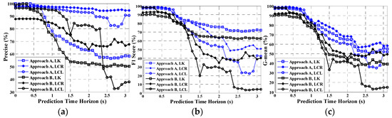 As the prediction time horizon increases, the performance of Approach B will decrease sharply (Figure 11a). However, the proposed approach can keep a slower decreasing rate. After 1.5 s, all three measurements are below 90%. This is mainly caused by the stochastic behavior of the target vehicle. It is even harder for a human driver to predict surrounding vehicles’ behaviors over such a long term. Most previous studies just try to improve the prediction performance of the lane-changing behavior (LCL, LCR), but the precision of LK was neglected [14,16]. In this study, we found that LK is pretty hard to predict for the urban roadways (the lowest precision in Figure 11). This may be caused by the highly dynamic nature of urban traffic. Compared with freeway traffic, the speed of the target vehicles is lower but more unexpected behaviors occur, like a sharp cut-in.
