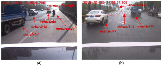 In this section, two representative experimental scenarios (as Figure 12 shows) are illustrated. The first scenario is at an arterial route, where there is a broken-down car parked in the third lane (counted from the right side of the route). A warning triangle is placed at the rear of the broken car. Some vehicles and motorcycles are rushing from the back of the ego vehicle. The white vehicle numbered 56 (vehicle56; the ID was assigned according to the target tracking algorithm) is approaching the warning triangle (staticobstacle101), while vehicle 60 (vehicle60) and vehicle 63 (vehicle63) are moving in the second lane. The driving behavior prediction algorithm can predict all the behaviors for these three vehicles and the motorcycle (dynamicobstacle57). In this paper, we just present the results for vehicle56, which is surrounded by two right-side moving vehicles and a static obstacle at the front. The second scenario is near a supermarket; there are three moving vehicles (vehicle346, vehicle379, and vehicle409), one junction (junction214) with a sidewalk (sidewalk75), and one pavement sign at the front of the ego vehicle. Some vehicles are parked in the rightmost lane. vehicle379 is maintaining a high speed and the proceeding vehicle has a very low velocity. vehicle409 is also keeping a high speed to travel through the sidewalk. This scenario can be considered an overlapped scenario, consisting of a junction scenario and a non-junction scenario. The results of driving behavior prediction for vehicle379 are presented in the following paragraphs.