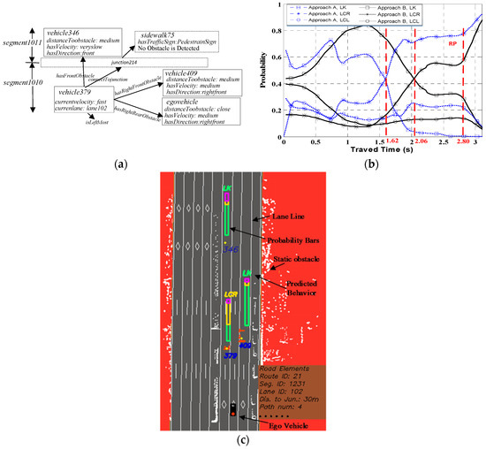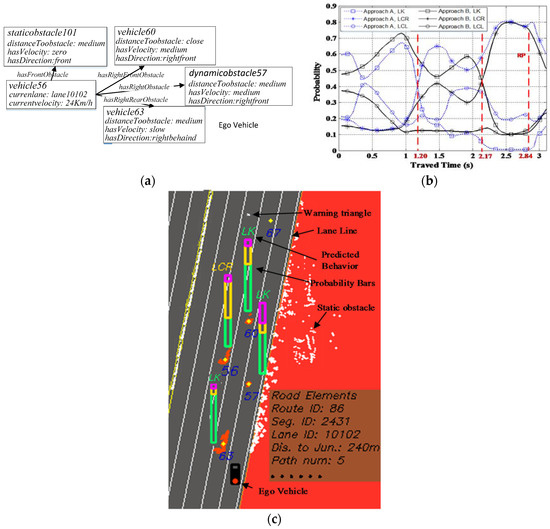 For Scenario 1, in fact, vehicle56 changed lanes to the right before arriving at the warning triangle. Approach A and Approach B were applied to predict this lane-changing behavior. The results for Scenario 1 are shown in Figure 13. For Approach A, the relative positions of the moving obstacles and their semantic interrelationships (shown in Figure 13a) are analyzed first. Then, the rule-based reasoning module generated the candidate models and input features of the models according to the relationships between vehicle56 and the surrounding objects (for vehicle56, Rule #2 in Table 2 is activated). The a priori probabilities were combined with the a posteriori probabilities by Equation (20) and the behavior tag is defined by Equation (21). Figure 13b shows the results of Approaches A and B. Approach A can predict the LCR intention about 1.64 s before the RP, while Approach B can predict the LCR intention 0.67s before the RP. This means Approach A can extend the prediction time horizon by 0.95 s. The scenario inference interface of the proposed approach is shown in Figure 13c. The non-drivable area is in red and static obstacles are represented by white dots. The moving obstacles are plotted in red color and their centers (yellow dots) are also marked. The behavior generated by the proposed approach for each target is represented by corresponding abbreviations and probability bars.