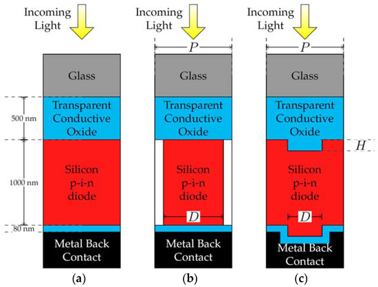 The schematic cross-sections of microcrystalline silicon (μc-Si:H) solar cells in superstrate configuration are depicted in Figure 1. A solar cell on a flat substrate is shown in Figure 1a. Cross-sections of solar cells with textured contacts and absorber layer are shown in Figure 1b,c, respectively. The cross section in Figure 1b,c shows a slice through the center of a 3D unit cell. All three solar cell structures follow the same basic layer sequence with: a 500 nm thick sputtered aluminum doped zinc oxide (ZnO:Al) front contact, followed by a μc-Si:H p-i-n diode with a total thickness of 1000 nm, a back reflector consisting of 80 nm thick ZnO:Al, and a perfect electrical conductor (PEC, 100% reflection) terminating the stack. The layer sequence used for the simulations is consistent with structures used in the literature [4,6]. The thickness of the ZnO:Al front contact layer is consistent with reference solar cells prepared on flat substrates [4,6]. The thickness of the p-layer of p-i-n diode is assumed to be 30 nm, while the n-layer of the p-i-n diode has a thickness of 10 nm. In order to realize a solar cell with textured absorber, the p-i-n diode is patterned, while, in the case of a solar cell with textured contacts, only the front contact is textured. Subsequently, the p-i-n layer stack and back contact of the solar cell with textured contacts are formed on the front contact. The morphology of the p-i-n layer stack and back contact follows the front contact morphology. Hence, all layers of the solar cell are textured. However, in the following the structure is named solar cell with textured contact layers to point out that only the front contact layer is intentionally textured during the fabrication process. The subsequently formed p-i-n layer stack is unintentionally textured. The texturing of the p-i-n layer stack is the consequence of preparing the layers on a textured substrate.