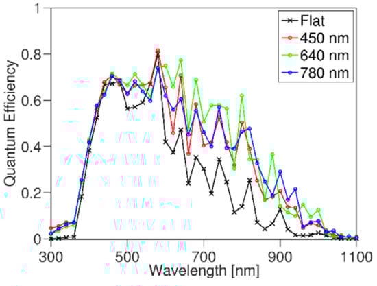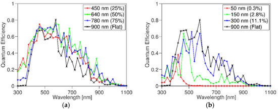 The reference solar cell on a flat substrate (Figure 1a) exhibits a short circuit current density of 12.4 mA/cm2. The corresponding quantum efficiency is shown in Figure 3a,b (black curve). Due to silicon’s strong absorption at short wavelengths, light is absorbed within the first few hundreds of nanometers of the solar cell. At long wavelengths, the absorption coefficient is much weaker, so a large fraction of light is able to pass through the silicon layer and is reflected by the back contact. This leads to the constructive and destructive interferences of the forward and backward propagating waves and the formation of interference peaks in the quantum efficiency. Only a fraction of the incident light is absorbed, which limits the quantum efficiency. Therefore, one of the primary ways to achieve improved performance of microcrystalline silicon solar cells at long wavelengths is to introduce improved light management techniques.