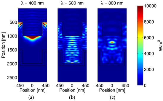 Power loss profile of a solar cell with textured contact layers for incident wavelengths of: 400 nm (a), 600 nm (b), and 800 nm (c). The edge-length (D) and the height (H) of the grating is 640 nm and 500 nm, while the period of the unit cell is 900 nm.