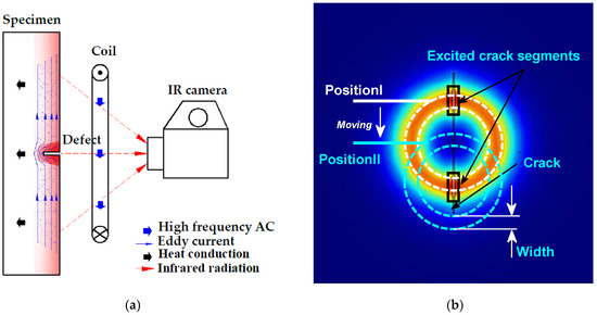 A basic schematic diagram of ECPT is shown in Figure 1a. A coil with high frequency alternating current (AC) produces a short burst of electromagnetic excitation and thereby induces eddy currents (ECs) in the conductive material. The induced ECs concentrate in a skin depth of homogeneous material, and a local temperature rise can then be caused by the effect of Joule heating from the eddy currents. The heat will be conducted from the heated area to other places until a thermal balance is finally reached. In case there is a surface crack in a conductive material, as depicted in Figure 1a, the presence of a crack can cause a diversion in the EC flow and heat conduction, which leads to a different temperature distribution pattern on the surface [19]. Hence, the crack can be detected by the variation of temperature distribution between the defect and the surrounding sound areas in the IR images.