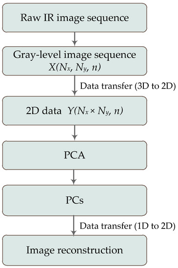 Principal component analysis (PCA) [20,21,22] is a common image processing method usually used in thermography to improve the sensitivity of crack detection. A detailed algorithm of PCA can be found in a previous work [19]. Figure 2 shows the schematic diagram of PCA-based image reconstruction method. Firstly, the IR image sequences captured by the IR camera are converted to gray-level image sequences. Here, represents the pixel value of gray-level image sequences, which is a 3D matrix. The means the resolution of camera, and n is the number of images. Next, the 3D matrix X is transferred to a 2D matrix as the input data of image processing. Then, the matrix U is processed by PCA, generating the principal components (PCs). Finally, the appropriate PCs are transferred to 2D arrays to form new images, which can improve the detection sensitivity and increase the signal-to-noise ratio of raw IR images.