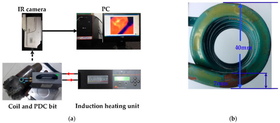 The experimental setup in this study is shown in Figure 3a. An induction heating system (EasyHeat 0224, Ambrell, NY, USA) is used for thermal excitation. In order to fit the complex geometry of a PDC bit, the excitation coil is designed as an annular coil as shown in Figure 3b. The induction heating system provides a maximum excitation power of 2.4 kW, a maximum output current of 380 A, and an excitation frequency range of 150~400 kHz. The temperature response of the specimen surface is recorded by an infrared camera (SAT-HY6850) with 320 × 240 pixels at a frame rate of 25 Hz and a spatial resolution of 1.3 rad. The thermal sensitivity of the camera is 80 mK and the accuracy is ±2%.