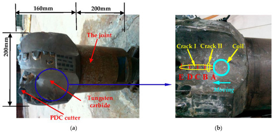 A PDC bit retired from oil drilling field is used as experimental specimen in this study, as shown in Figure 4a. A PDC bit is comprised of three parts: a PDC cutter, a tungsten carbide matrix, and the joint. There are two crossed surface cracks on the tungsten carbide matrix, which are labeled as Crack I and Crack II, as shown in Figure 4b. Their widths are both less than 0.2 mm, which makes it very difficult for direct visual observation. The lengths of Crack I and Crack II are 88 mm and 21 mm, respectively. Figure 4c shows the zoomed view of Crack I. The polycrystalline diamond compact cutter comprises a thin layer of sintered polycrystalline diamond bonded to a tungsten carbide–cobalt substrate. The tungsten carbide matrix is one kind of alloy steel that mainly includes W, Fe, T.C, F.C, Si, Ni, Co, and other components. Its electrical conductivity is about S/m and thermal conductivity is 0.42 W/(cm·K). The conductivity of tungsten carbide makes it possible to heat the PDC bit matrix by induction heating.