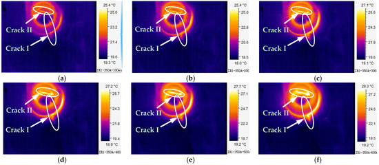 According to the findings in previous works [12], the frame at the end time of heating excitation stage in each infrared sequence was chosen for IR image analysis to evaluate the influence of heat excitation duration on detection results. Figure 5 shows IR images recorded with different excitation duration when the coil was located at Position D. We can see the segments of two cracks can be easily recognized in Figure 5a–f despite the interference of excitation coil in visual field.