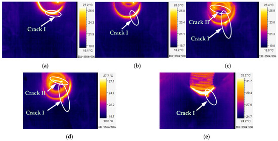 From Figure 3a, we can see that the size of the annular coil is too small to detect the surface cracks on the bit matrix. Additionally, the power of the induction heating system is also limited for exciting the whole bit at one time. Therefore, as discussed in Section 2.1, ECPT can be applied to detect the cracks in a successive scanning manner. As shown in Figure 4b, the induction coil was successively moved from Position A to Position E in such a way: the induction coil was moved 20 mm each time and heat the PDC bit for 500 ms followed by a cooling time of 3.5 s at each position. Additionally, the recording process of the IR camera is an ongoing process during the detection for the five positions. After the excitation coil scanning the whole surface of bit matrix, each segment of each surface crack can be roughly detected in sequence.